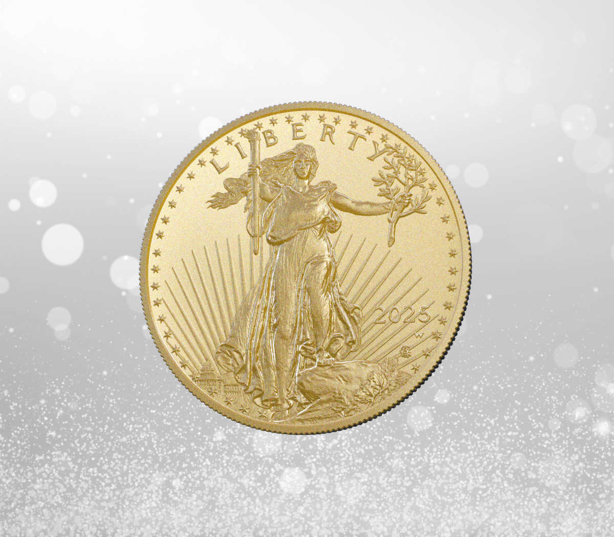 The obverse of the 2026 Gold American Eagle features Augustus Saint-Gaudens' celebrated image of Lady Liberty, holding a torch in her right hand and an olive branch in her left, a symbol of enlightenment and peace.